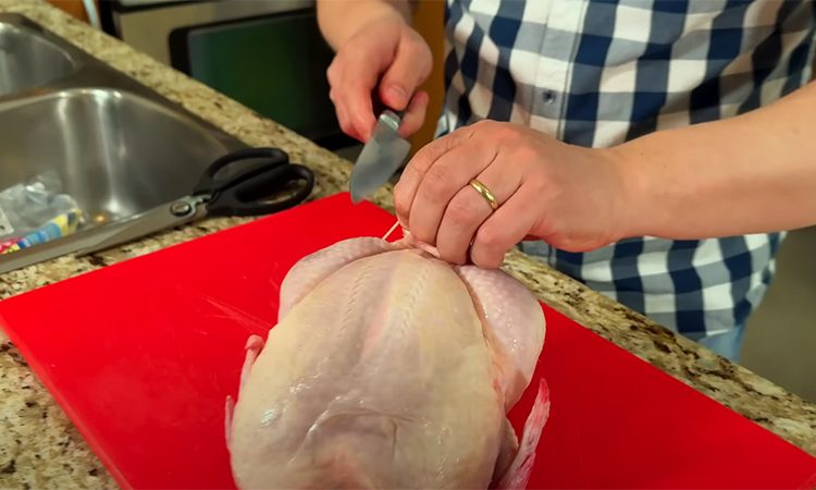 Подверните крылья под грудку, чтобы они не подгорели, и уложите ножки. Переложите курицу на застелённый бумагой противень. Запекайте при 180° на среднем уровне в течение часа (для курицы 1,5 кг), ориентируйтесь по внутренней температуре — она должна достичь 82° в самой толстой части.