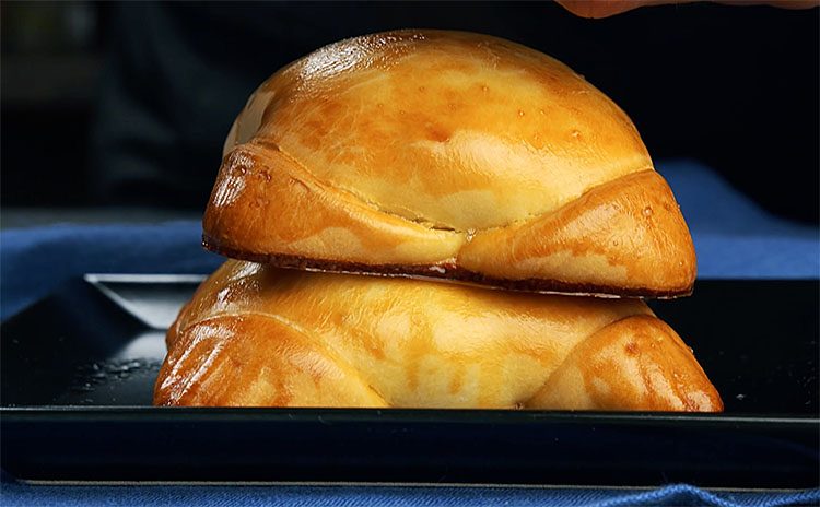 5. Аккуратно защипните края теста сверху, чтобы начинка была полностью закрыта, придайте булочке красивую форму (например, скрутите уголки или сделайте защипы крест-накрест).