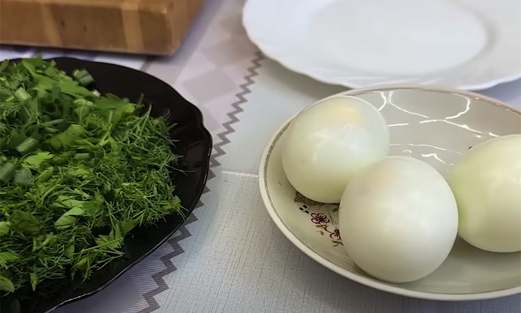 Нарежьте зелёный лук, укроп и петрушку, добавьте мелко нарезанные варёные яйца и перемешайте начинку. Для теста слегка подогрейте кефир с водой до тёплого состояния, чтобы он начал слегка сворачиваться, добавьте к двум сырым яйцам с солью и сахаром. Просейте муку, замесите тесто средней густоты, введите соду и растительное масло, тщательно вымешайте.