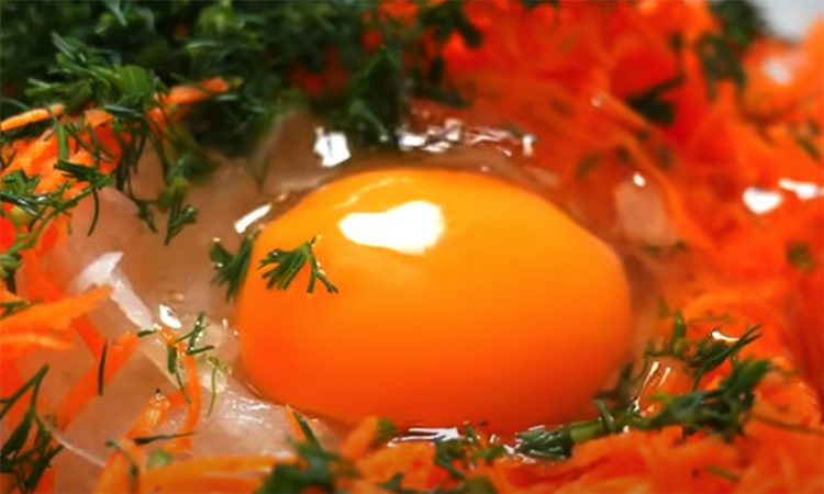 Натрите кабачок на крупной тёрке, перемешайте с солью и оставьте на 5–10 минут, чтобы выделился сок, затем тщательно отожмите. Морковь натрите на мелкой тёрке, лук — на крупной, укроп и зелёный лук нарежьте. Соедините все овощи, добавьте яйцо, немного подсолите, поперчите и перемешайте.