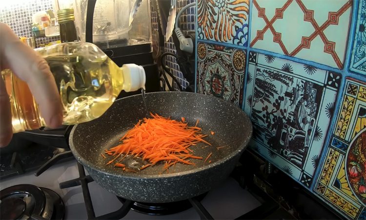 Тонко нарежьте морковь соломкой и обжарьте в растительном масле на хорошо разогретой сковороде. Добавьте мелко нашинкованную капусту, по необходимости ещё измельчив ножом или на тёрке, и готовьте до мягкости. Шампиньоны нарежьте мелкими пластинками, выложите к овощам, обжаривайте до испарения лишней влаги.