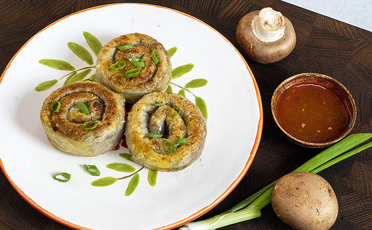 Рисовую бумагу смачивайте водой до мягкости, выкладывайте начинку полоской и аккуратно заворачивайте в плотные рулетики, формируя «улитки» или классические спринг-роллы. Обжаривайте на растительном масле до румяной хрустящей корки с обеих сторон.
