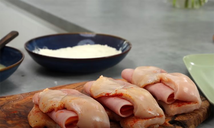 Отбейте каждое куриное филе, чтобы получить ровный пласт, приправьте солью, перцем и паприкой. На каждое филе выложите по два ломтика сыра и ломтик ветчины, сверните плотным рулетом и слегка прижмите. Обваляйте рулеты в муке, затем обмакните в взбитые яйца и запанируйте в сухарях.