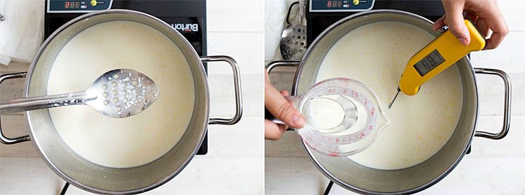 1. Влейте молоко в чистую кастрюлю. Оставьте его при комнатной температуре на 15–20 минут (если из холодильника). Разведите лимонную кислоту в 50 мл тёплой воды, хорошо перемешайте до полного растворения. Начинайте медленно нагревать молоко на среднем огне, постоянно помешивая венчиком, чтобы не пригорело. Когда температура достигнет 12 °C, аккуратно влейте раствор лимонной кислоты, продолжая помешивать. Это подкислит молоко, сделав его пригодным для сворачивания ферментом. Продолжайте нагрев молока, постоянно помешивая. При достижении 32 °C, снимите кастрюлю с огня.