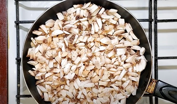 2. Шампиньоны очистите и нарежьте небольшими кусочками, затем обжарьте на растительном масле 5–7 минут до золотистости и полного выпаривания жидкости, после чего оставьте остывать.