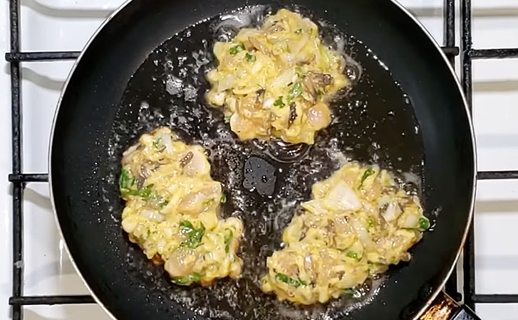 4. Разогрейте сковороду с маслом и выкладывайте приготовленный фарш столовой ложкой, формируя котлеты прямо на сковороде (руками лепить не нужно). Обжаривайте их на среднем огне по 3–4 минуты с каждой стороны до золотистой корочки. Если котлеты получаются достаточно толстые, можно накрыть крышкой и потомить ещё 5 минут, чтобы они полностью прожарились внутри.