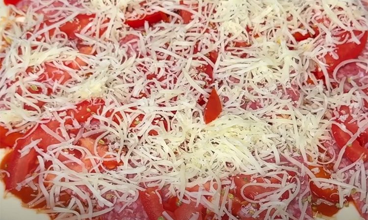 Подготовьте начинку: нарежьте перец и помидор тонкими кружочками, сыр натрите, колбасу нарежьте ломтиками. Когда тесто в сковороде поднимется и покроется пузырьками, распределите соус, присыпьте половиной сыра, разложите перец, помидоры, колбасу и снова посыпьте сыром.
