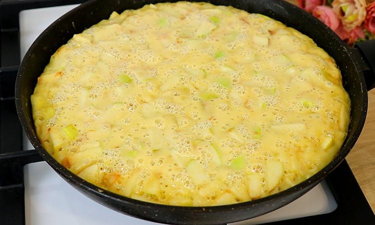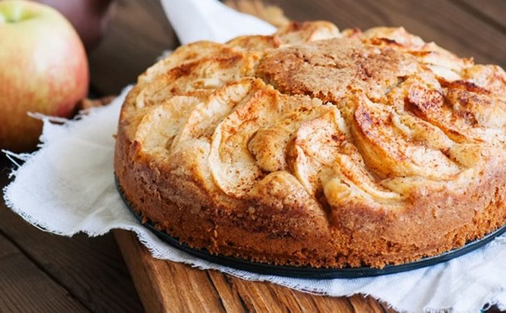 Пирог на сковороде получается особенно нежным за счёт йогурта, фрукты не дают тесту быть сухим.