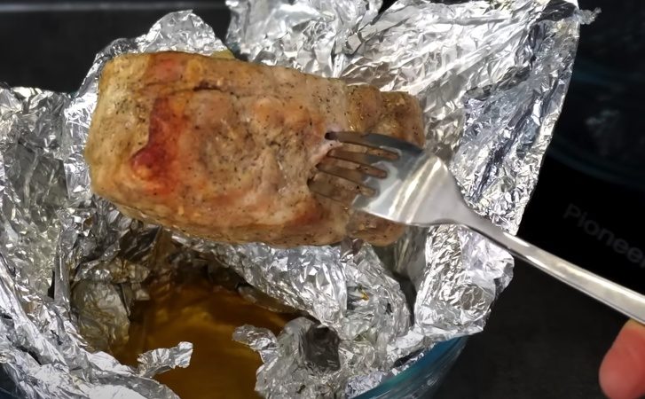 Заверните в фольгу в 2–3 слоя и запекайте при 200 °C в режиме гриль около часа. После сигнала духовки дайте мясу постоять 5 минут в фольге.