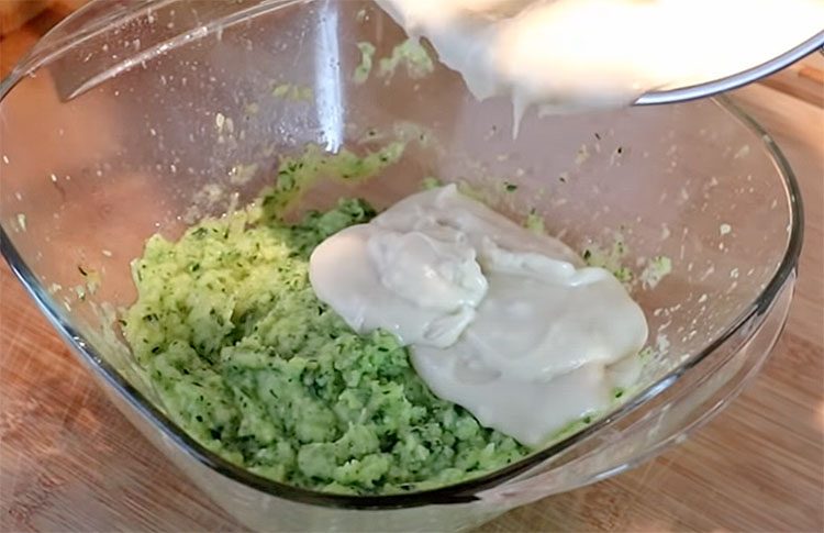 5. В кабачковую массу добавьте соус Бешамель. Хорошо перемешайте до однородной кремовой консистенции.