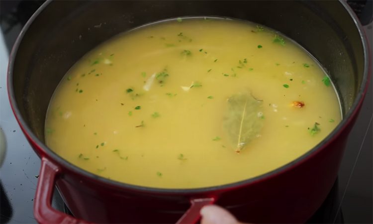 Залейте курицу холодной водой в большой кастрюле, поставьте на средний огонь, не солите. Доведите до лёгкого кипения, убавьте до минимума и снимайте пену для прозрачного бульона. Варите под чуть приоткрытой крышкой полтора-два часа, чтобы мясо стало мягким. В самом конце добавьте соль, лавровый лист, можно положить чеснок или немного имбиря по вкусу.