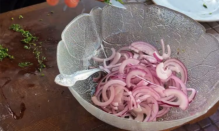 Пока мясо маринуется, подготовьте закуску. Нарежьте помидоры дольками, красный лук тонкими полукольцами, мелко порубите зелень. В отдельной емкости смешайте масло, уксус, черный перец, соль, прованские травы и измельченный чеснок. Добавьте зелень и лук, перемешайте. Соедините маринад с помидорами и аккуратно перемешайте, стараясь не повредить дольки.