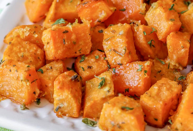 Разогрейте духовку до 230 °C. Смешайте кусочки батата с маслом, солью и перцем прямо на противне. Запекайте 35–45 минут, периодически помешивая, пока ломтики не станут мягкими и не покроются золотистой корочкой.