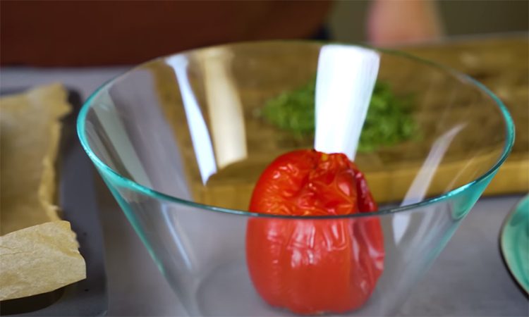 Разогрейте духовку до 180 °C. Перцы вымойте, обсушите и выложите на противень. Запекайте 30–40 минут до мягкости, время зависит от вашей духовки. Переложите горячие перцы в миску, накройте крышкой и оставьте на несколько минут, чтобы они немного остыли и легче чистились.