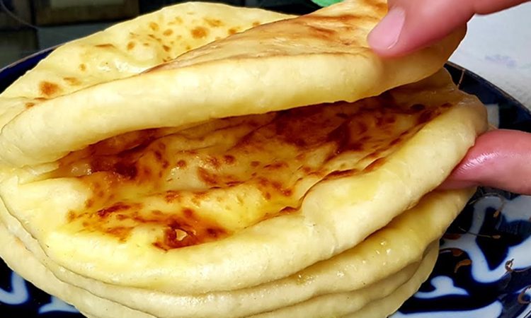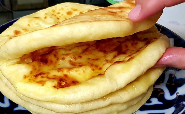 При желании введите размягчённое сливочное масло — оно усилит сливочный вкус. Разделите тесто на 4 равные части и скатайте в шары. Начинку также поделите на 4 части. Слегка припылите поверхность мукой, расплющите каждый шар в лепёшку руками или скалкой. В центр положите порцию начинки, защипните края и аккуратно придайте форму круглой лепёшки, стараясь равномерно распределить сыр внутри.