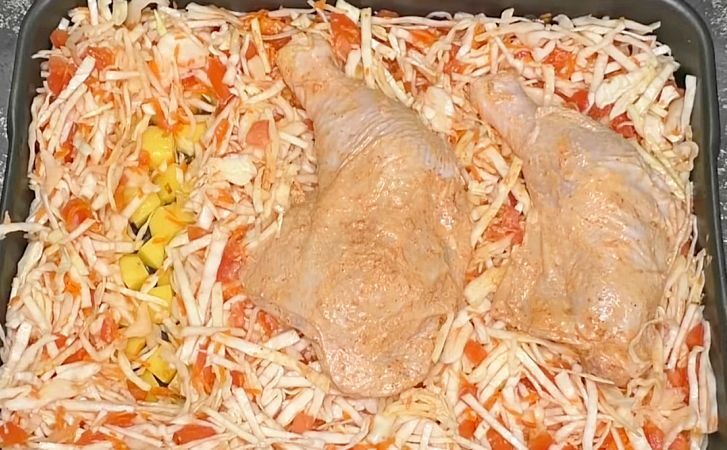 3. На картофель с луком выложите капустно-морковную массу. Сверху разложите замаринованные куриные окорочка, слегка прижав их к овощам.