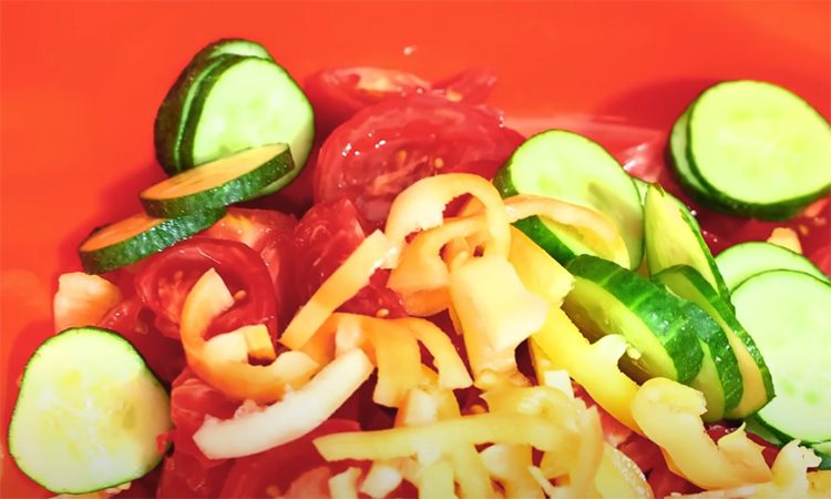 Вымойте и нарежьте помидоры, огурцы и сладкий перец. Переложите в большую миску. Добавьте нарезанный лук, чеснок и петрушку. Посыпьте солью, влейте оливковое масло и тщательно перемешайте. Оставьте на час, чтобы овощи пустили сок. Подготовьте стерильные банки и наполните их овощами вместе с соком.