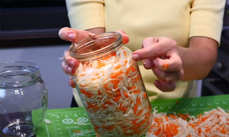 Нашинкуйте капусту ножом, стараясь делать тонкие полоски. Переложите её в большую миску и слегка примните руками, но не пересаливайте, чтобы она сохранила хруст. Морковь натрите на крупной тёрке и перемешайте с капустой. Подготовленные овощи разложите по литровым банкам, утрамбовывая как можно плотнее.