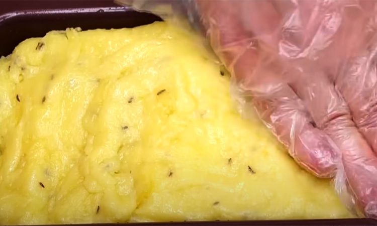 В конце добавьте чайную ложку тмина и перемешайте. Подготовьте форму и переложите в неё сырную массу, разровняйте поверхность руками и накройте плёнкой. Оставьте при комнатной температуре до полного остывания, затем уберите в холодильник. После застывания сыр станет плотным и готовым к подаче.