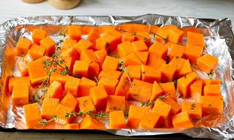 Очистите тыкву овощечисткой, разрежьте пополам и уберите семена. Нарежьте мякоть кубиками или дольками одинакового размера. Разделите заготовку на две части. В каждую миску добавьте масло, чеснок, тимьян, соль и перец, перемешайте. Выложите тыкву на противень в один слой, застелите пергаментом. Разогрейте духовку до 220° без конвекции (или до 200° с конвекцией).