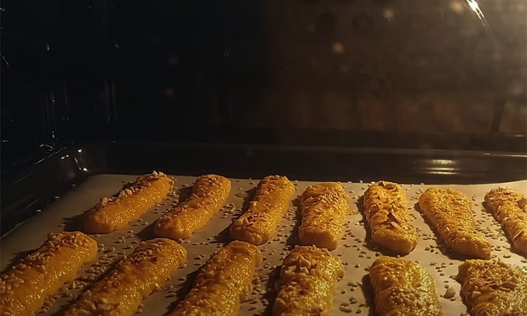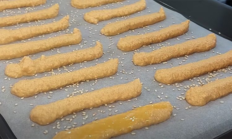 Для аромата используйте щепотку сушёного чеснока и паприки, влейте немного лимонного сока и добавьте разрыхлитель. Взбейте всё в густую массу, похожую на плотное тесто, которое держит форму. Переложите массу в пакет или кондитерский мешок, застелите противень пергаментом, присыпьте его кунжутом и отсадите палочки нужного размера.
