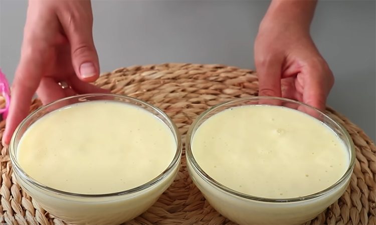 В миске соедините яйца и соль, слегка размешайте венчиком. Влейте кефир, затем добавьте муку с разрыхлителем и замешайте жидковатое тесто без комков. Разделите его на две равные части. Сковороду диаметром 22–23 см смажьте маслом и застелите дно пергаментом.