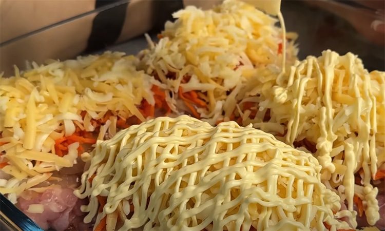 Соберите блюдо. На каждый кусочек мяса равномерно выложите обжаренный лук, сверху распределите морковь по-корейски. Два вида сыра натрите на крупной тёрке и перемешайте. Покройте мясо слоем сыра, стараясь, чтобы он равномерно распределился по поверхности.