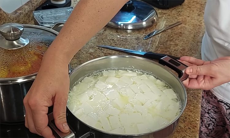 Когда молоко станет приятно теплым, выключите плиту, накройте кастрюлю крышкой и оставьте в теплом месте. Можно поставить на солнце или возле батареи. Время заквашивания занимает от 6 до 14 часов в зависимости от температуры окружающей среды. Через 6 часов проверьте состояние молока. Если масса уже прокисла и приобрела вид густой простокваши, можно переходить к следующему этапу. Не перемешивая, нарежьте сгусток ножом на кубики примерно одинакового размера.