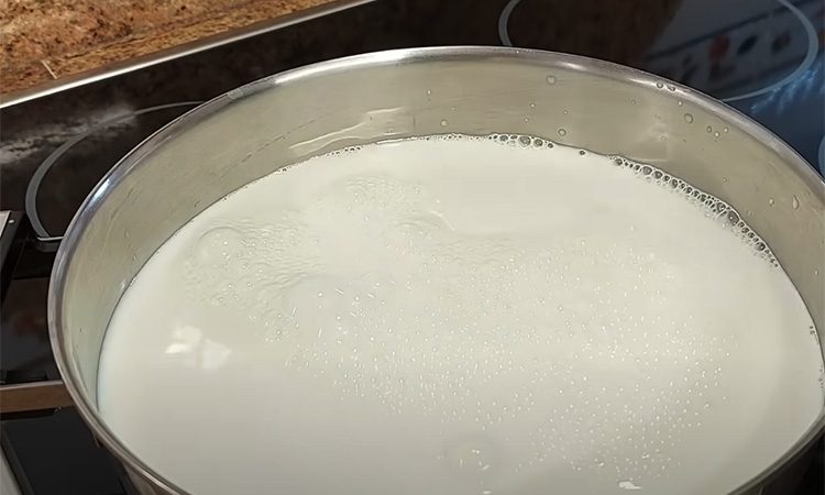В большую кастрюлю налейте два литра молока. Молоко должно быть магазинное, но без добавок. К нему добавьте натуральный йогурт или сметану, можно использовать греческий йогурт или самый простой, главное, чтобы он был натуральным. Жирность готового творога будет зависеть от жирности молока и закваски. Включите нагрев и начните постепенно помешивать смесь, чтобы она быстрее прогрелась и начала заквашиваться.