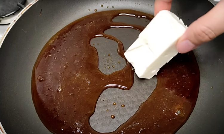 1. На сухую сковороду высыпьте сахар. Готовьте на среднем огне, не мешая, пока он не начнёт плавиться и превращаться в карамель (сначала появятся комочки, затем жидкая золотистая масса). Добавьте сливочное масло, аккуратно перемешайте деревянной лопаткой.