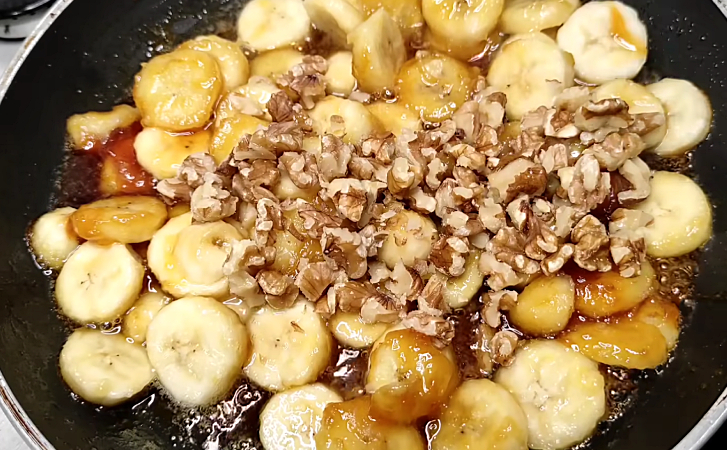 2. Очистите бананы, нарежьте кружочками толщиной около 0,5 см. Выложите, аккуратно перемешайте и тушите 4–5 минут, пока они слегка не размягчатся и не покроются карамельной глазурью. Всыпьте нарубленные грецкие орехи, прогрейте ещё 1 минуту. Снимите сковороду с огня и оставьте смесь остывать.