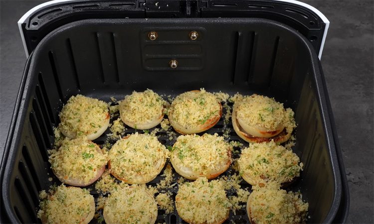Разогрейте аэрофритюрницу до 160 градусов и выложите дольки лука в корзину одним слоем. Готовьте в течение тридцати минут, пока лук не станет мягким и прозрачным. Пока идет первый этап приготовления, подготовьте ароматную смесь. Для этого соедините панировочные сухари, мелко натертый пармезан и мелко нарезанную петрушку. Хорошо перемешайте, чтобы сыр распределился равномерно. Когда лук станет мягким, достаньте корзину и обваляйте каждую дольку в приготовленной смеси.