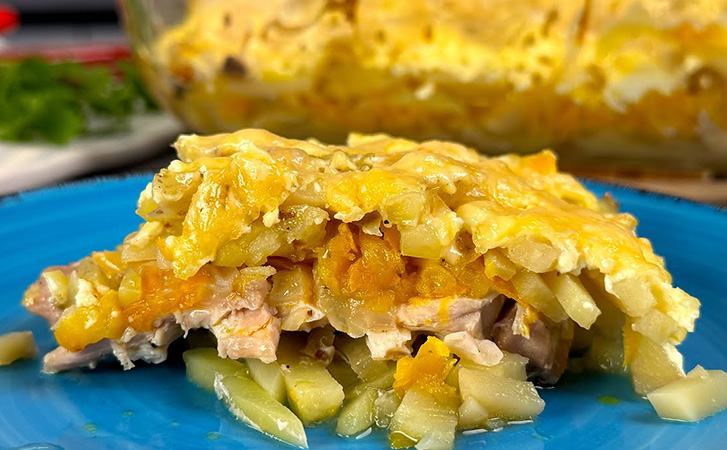 Курица и картофель кажутся привычным сочетанием, но в этом рецепте они раскрываются по-новому. Сначала мясо слегка маринуется, затем собирается в форме слоями с овощами и картофелем, а сверху покрывается сыром. Во время запекания все ингредиенты пропитываются соками и специями, и получается ароматная, сытная и красивая запеканка, которая соберет всю семью за столом.