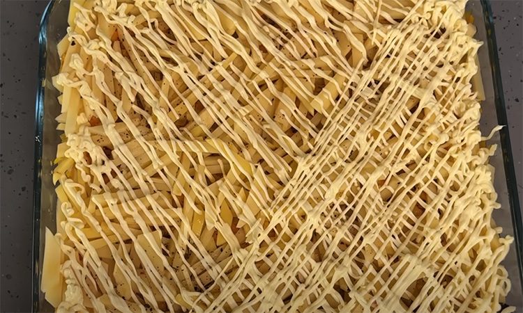 Сверху нанесите сеточку из майонеза, переложив его в кондитерский мешок или просто распределив ложкой. Накройте форму фольгой и отправьте в духовку, разогретую до 200°.
