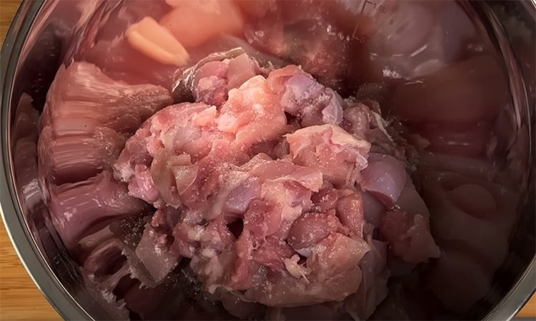 Мясо нарежьте небольшими кусочками, переложите в глубокую миску, слегка подсолите, добавьте немного молотого черного перца и несколько капель растительного масла. Тщательно перемешайте и оставьте на время, пока будете готовить овощи. Лук очистите и нарежьте мелким кубиком. Морковь натрите на крупной терке. В сковороде разогрейте немного растительного масла и сначала обжарьте лук до прозрачности. После этого добавьте морковь и продолжайте жарить, пока овощи не приобретут легкий золотистый оттенок.