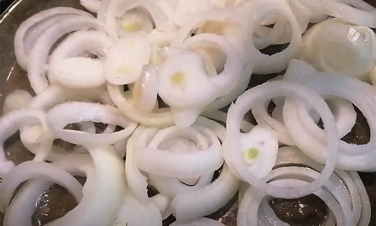 Перемешайте и готовьте на среднем огне, пока лук не станет мягким и прозрачным. Форму для запекания смажьте маслом. Выложите на дно яблоки, поверх распределите печень, а сверху — лук со специями. Разогрейте духовку до 180° и запекайте 20 минут.