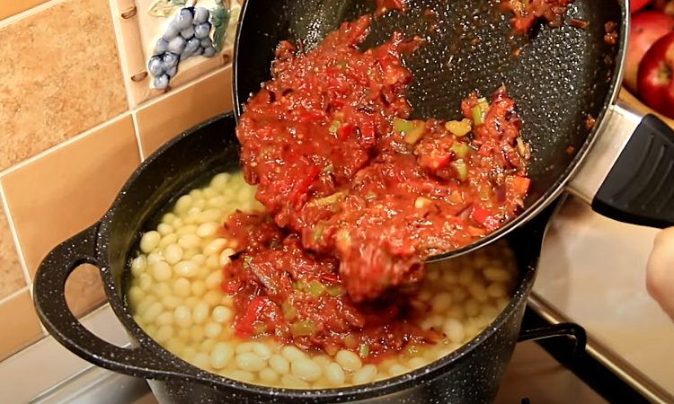 5. Переложите обжаренные овощи в кастрюлю с фасолью. Перемешайте и дайте супу прокипеть еще 5 минут, чтобы все вкусы смешались.