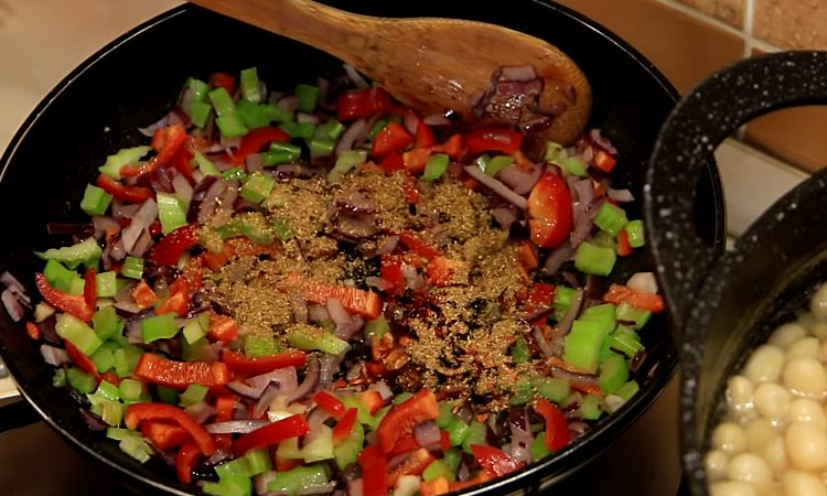 3. Разогрейте 2–3 ст. л. растительного масла на сковороде на среднем огне. Выложите лук и чеснок, обжаривайте 2 минуты до прозрачности и легкой золотистости. К луку и чесноку добавьте сладкий перец и сельдерей, перемешайте. Посыпьте молотым кориандром, сладкой паприкой, хлопьями чили и солью. Обжаривайте 3–4 минуты, помешивая, чтобы овощи слегка размягчились.