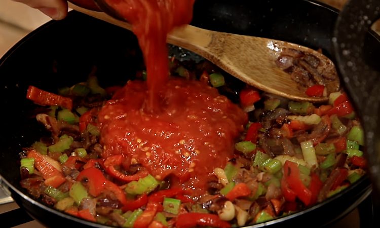 4. Добавьте к овощам натертые помидоры и томатную пасту. Тушите на среднем огне 4–5 минут, пока смесь немного не загустеет.