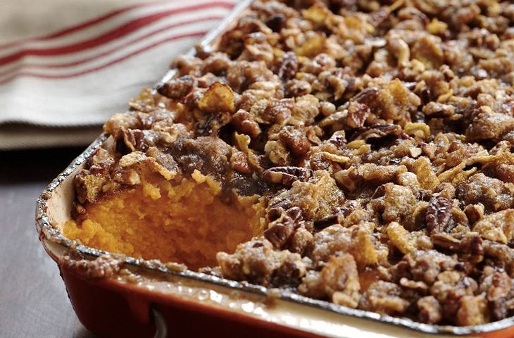 Пока пюре в духовке, слегка поджарьте орехи пекан на противне 5 минут и грубо нарубите. Смешайте их с кукурузными хлопьями, корицей, оставшимся маслом, мускатным орехом, сахаром и щепоткой соли.