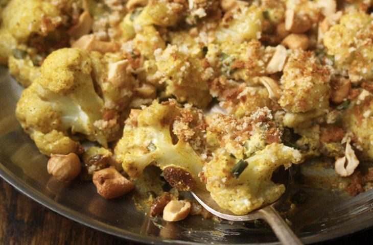 В миске соедините капусту с йогуртом, медом, луком, изюмом, карри и солью. Выложите смесь в форму, сверху присыпьте хлебными крошками и орехами кешью. Выпекайте около 30 минут до лёгкой золотистой корочки.