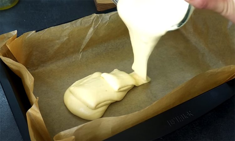 Тесто получится достаточно жидким, похожим на густой бисквит. Подготовьте форму — прямоугольную или круглую, застеленную бумагой для выпечки. Вылейте тесто, разровняйте поверхность и выпекайте при температуре 180 градусов около 15 минут. Готовность проверяйте деревянной шпажкой: если она выходит сухой, бисквит готов. Оставьте корж немного остыть, затем аккуратно обрежьте края, чтобы выровнять форму. Обрезки не выбрасывайте — они понадобятся для обсыпки.