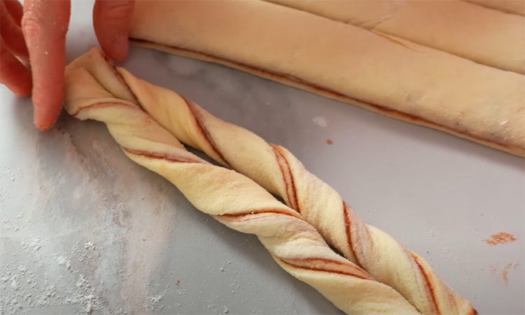 Легко раскатайте, чтобы тесто стало ровным. Нарежьте полоски шириной около 3,5 см, сделайте в каждой надрез и сверните их жгутом в виде узла. Переложите заготовки на противень, застеленный бумагой, накройте и оставьте подниматься около часа. Перед выпечкой смажьте смесью желтка и молока.
