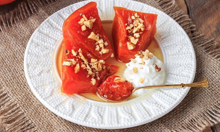 Тыква в этом турецком десерте проходит длительное томление, благодаря чему ее дольки становятся мягкими и прозрачными, сохраняя форму и приобретая сладость, напоминающую мармелад. Сироп с лимонной кислотой и сушеной мятой создаёт утонченный вкус, а обжаренные грецкие орехи добавляют насыщенность и приятную текстуру, превращая простую тыкву в необычное лакомство.