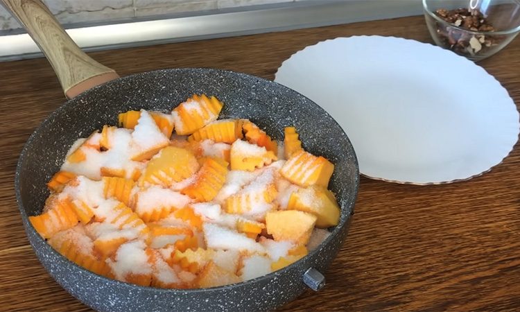 Очистите тыкву от кожуры и нарежьте её небольшими кусочками одинакового размера. Сложите их в широкую сковороду или сотейник и засыпьте сахаром. Добавьте щепотку соли, которая подчеркнёт сладость. Накройте крышкой и оставьте минимум на полтора часа, чтобы тыква пустила сок. Когда дно заполнится соком примерно на полсантиметра, поставьте сковороду на огонь ниже среднего и оставьте под крышкой на 30 минут.