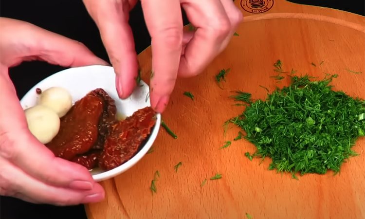 Подготовьте сливочное масло заранее, чтобы оно стало мягким при комнатной температуре. Переложите его в миску. Мелко нарежьте укроп, промойте его и обсушите бумажным полотенцем. Добавьте укроп к маслу. Если используете вяленые томаты, нарежьте их мелкими кусочками — они придадут маслу яркий вкус и лёгкую кислинку. На мелкой тёрке натрите чеснок, добавьте его в масло вместе с солью, перцем и по желанию натёртым сыром.