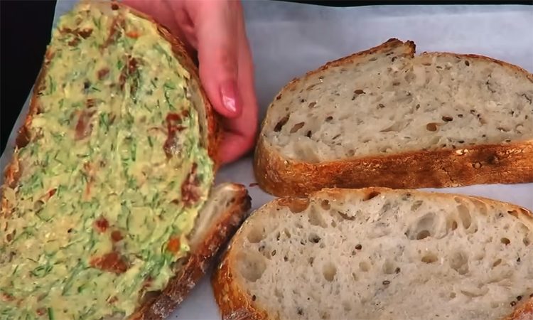 Сыр сделает аромат насыщеннее и добавит лёгкую солоноватую ноту. Всё тщательно перемешайте ложкой до получения густой ароматной пасты — так, чтобы масло вобрало запах зелени и чеснока. Возьмите хлеб. Лучше всего подходит батон, багет или домашний цельнозерновой хлеб. Нарежьте его довольно толстыми ломтями — примерно по 2 см. Выложите ломти на противень, застеленный бумагой для выпечки.