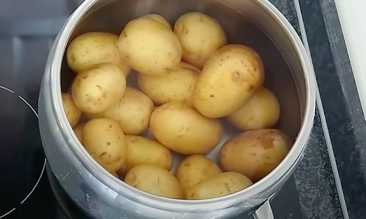 1. Тщательно вымойте картофель щёткой, чтобы удалить всю грязь, так как он будет готовиться в кожуре. Поместите картофель в кастрюлю, залейте холодной водой, добавьте немного соли. Доведите до кипения и варите на среднем огне 20–25 минут, пока картофель не станет мягким (проверяйте ножом или вилкой — он должен легко входить в центр клубня). Слейте воду и дайте картофелю слегка остыть (5–7 минут), чтобы с ним было удобно работать.