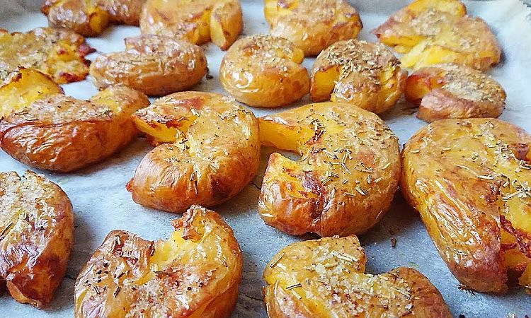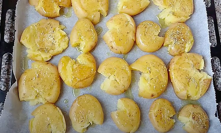 3. Разогрейте духовку до 180 °C (режим «верх-низ»). Застелите противень пергаментной бумагой или фольгой. Выложите картофель на противень на небольшом расстоянии друг от друга. Слегка придавите каждый клубень до плоской формы (примерно 1,5–2 см толщиной). Удобно использовать стакан с плоским дном или толкушку. Главное — не разрушить картофель полностью. Полейте каждый расплющенный картофель 1–2 чайными ложками заправки сверху, стараясь распределить ароматное масло равномерно.