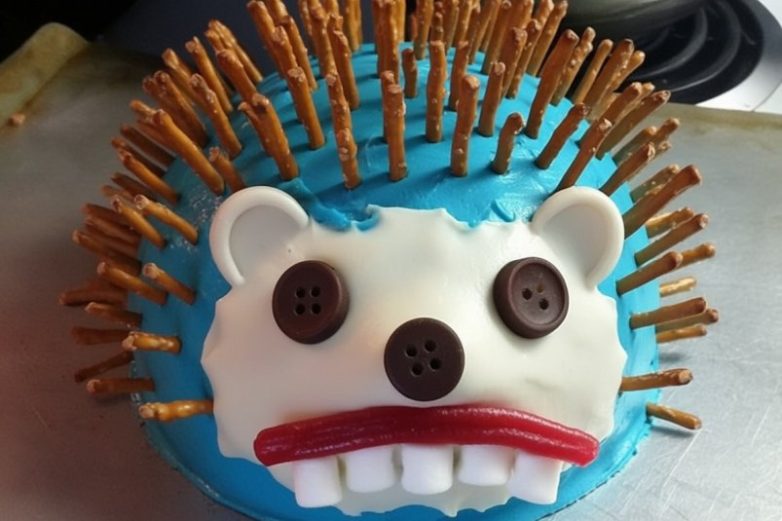 Название расшифровывается просто: «Блю» — от английского blue (голубой), ведь верх торта покрыт кремом с каплей пищевого красителя нежно-голубого оттенка. А «Еж» — потому что торт оформлен в виде симпатичного ежика с глазками, носиком и «иголками» из печенья.
